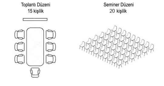 Toplantı Odası | En fazla 15 kişi (Dikdörtgen toplantı masası etrafında) | - Masa |